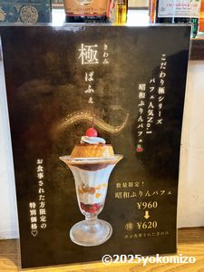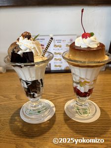 私は自家製コーヒーゼリーパフェ、友人は数量限定の昭和プリンパフェに。