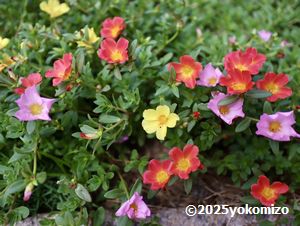 あまりの暑さに、花壇の花たちは少しお疲れ気味ですが、ポーチュラカだけは太陽を浴びて元気いっぱいに咲いています。